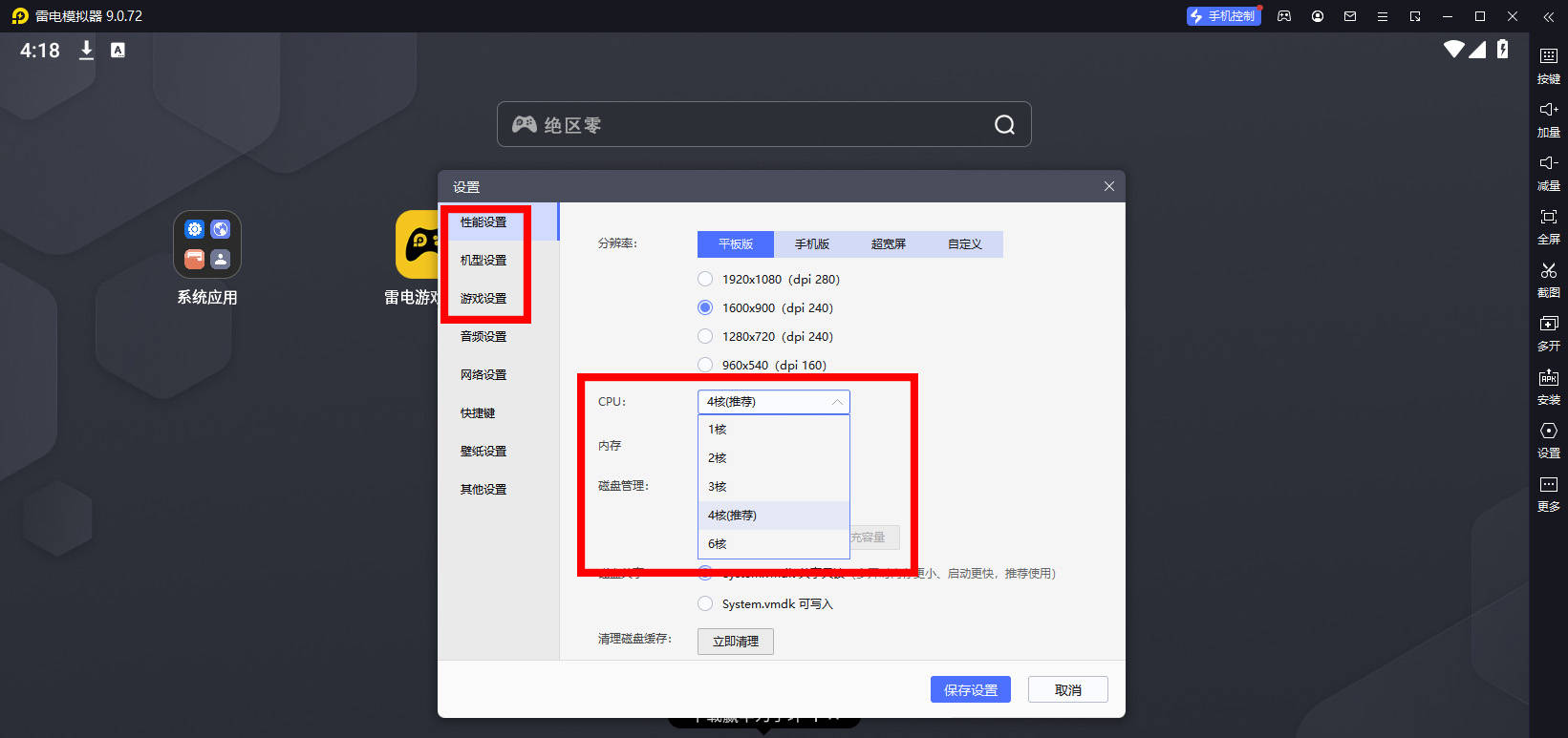 其次还可以在模拟器界面的右侧点击"设置",然后选择"性能设置"和"游戏设置"。参考下方的图示,根据你的电脑配置尽量调整性能设置,以确保绝区零电脑版的流畅游戏体验。