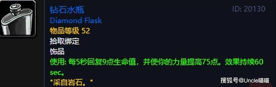 曾经让多少老战士玩家因为没选择他而删号重练的,战士专属50级职业任务奖励的此款钻石水瓶,喵叔不说他是能洞穿版本的天花板,但是他从拥有用到纳克萨玛斯开放之前都是没有任何问题的,1分钟75点的力量提高的意义想必大家都懂的,而且还能够花式卡回复畅游各种单刷场景,绝对是超模又有点BUG的神级蓝色饰品了,战士必须打卡!