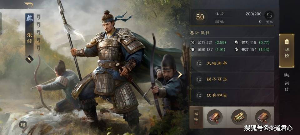 默认持有战法大破街亭的张郃,在三国谋定天下的游戏世界里到底算不算T0,这个问题的争议应该还是蛮大的。云弥彦在破甲神技大破街亭的基础上,给张郃依次叠加了锐不可当和伏兵四起,韬略则是机变和鬼谋、得势的善本。