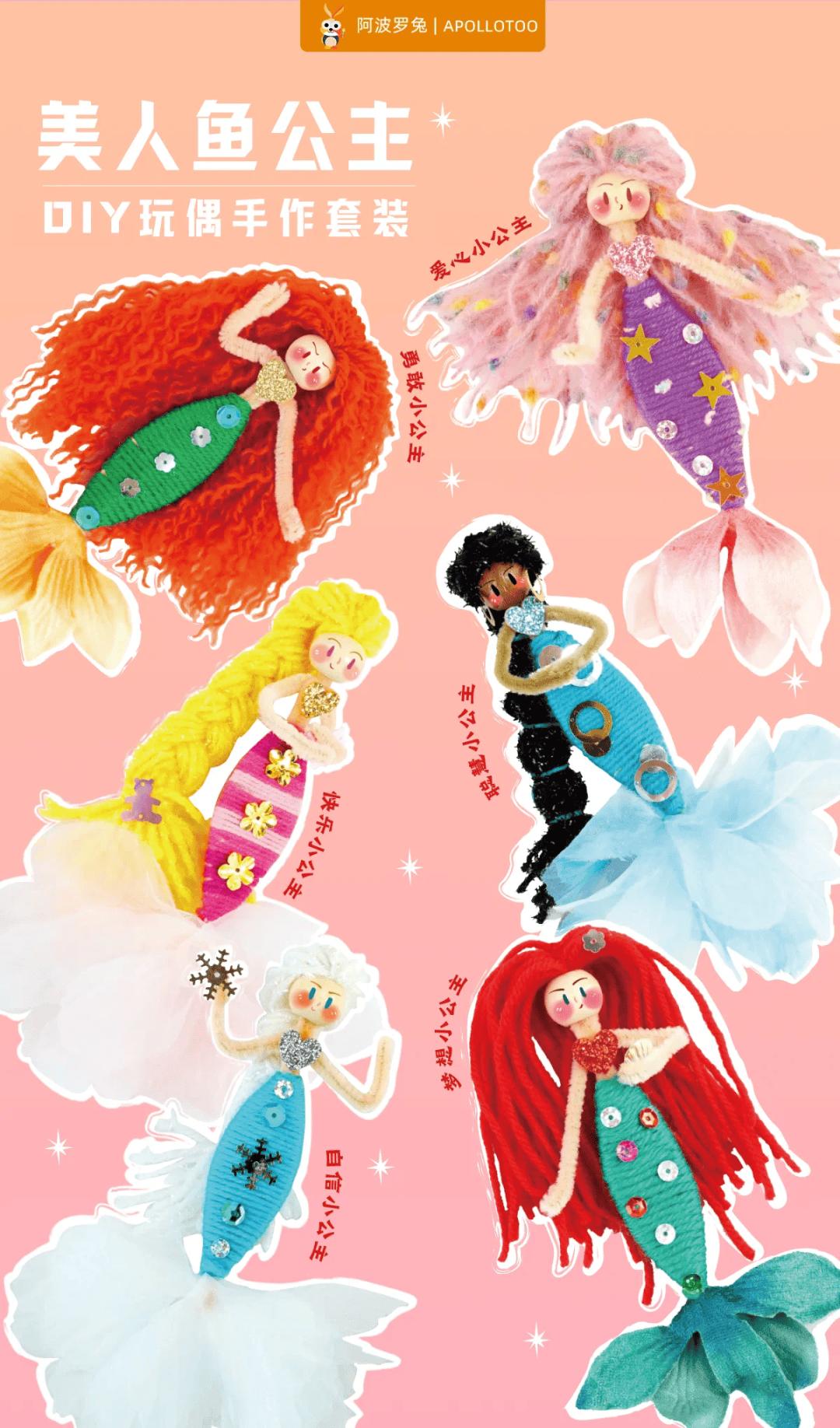 这是阿波罗的DIY美人鱼公主套装,让孩子亲自动手,梳一个漂亮的发型,装饰有个性的裙子,做出心目中的公主,创造属于自己的童话,哪个女孩能拒绝呢。