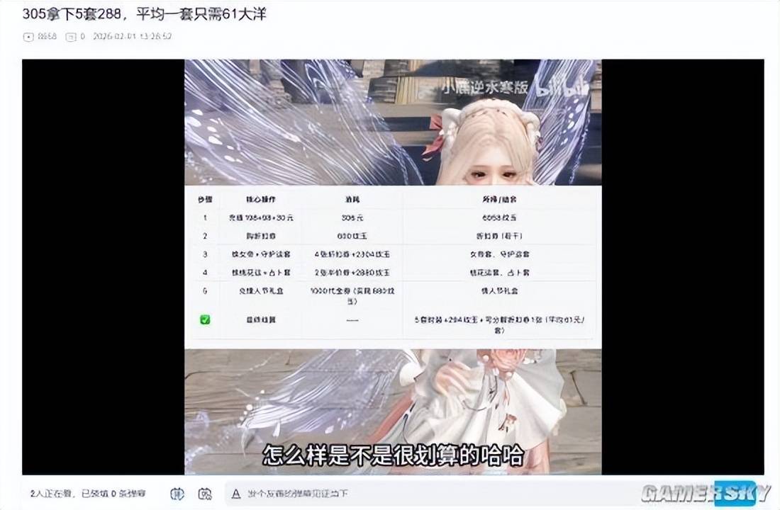 不少KOL推出的氪金教学,手把手教玩家如何薅羊毛。例如原本定价288元五套的“年限时装”,如果稍稍操作一下购买顺序,经过春节活动的各种优惠叠加,每套平均到手价仅需60元左右。这种充满诚意的优惠力度,让许多玩家心甘情愿地在游戏里置办起了“赛博年货”。