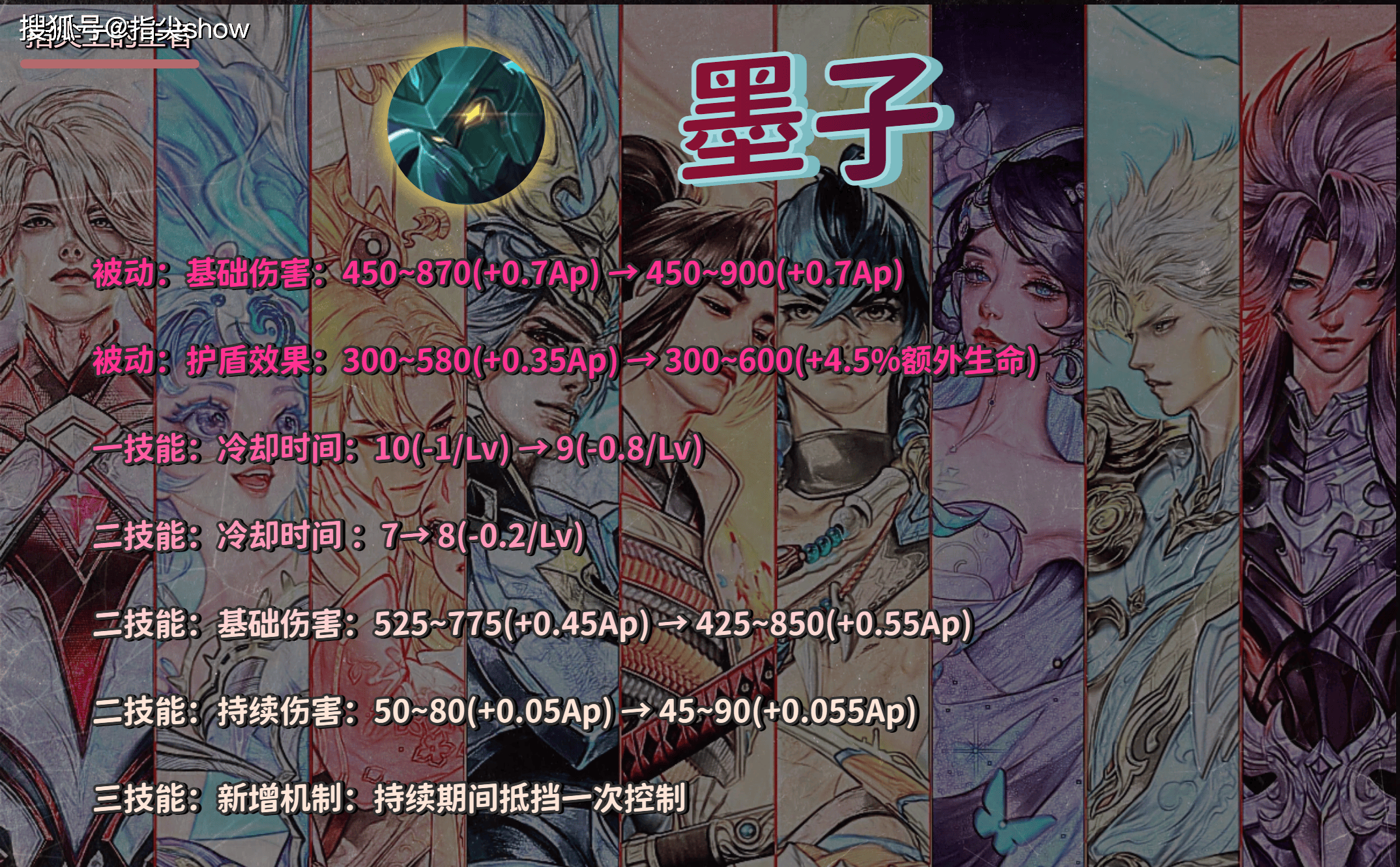 一技能,冷却时间10-5改成9-5,前期降低一秒CD,辅助中路双加强,容错更高,策划想加强的应该是中路清兵的墨子,需要近战,那么一技能CD快更好保命。