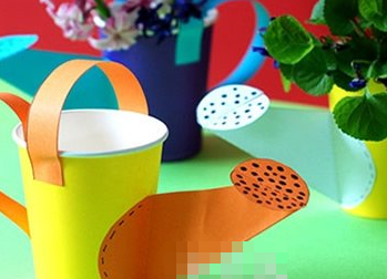 小朋友们喜不喜欢养花草?如果家里有养有盆栽,一个用来胶水的洒水壶是少不了的。今天我们要学习的废物利用小制作,就是用卡纸和一次性纸杯做一个迷你的洒水壶,真的可以装水,但不能喷洒~需要打印的图纸,打印到彩色卡纸上分别做成喷嘴、手柄和提手。图纸打印完成,另外准备好纸币、胶棒和剪刀。把打印好的卡纸剪下来,在喷嘴部分卡纸上涂胶水。沿虚线折起来,再把它粘贴在纸杯的侧面。最后把卡纸条粘贴到杯沿好侧身,做出提手和手柄,可爱的纸杯洒水壶制作完成。
