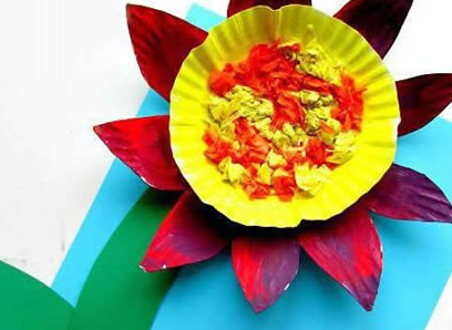 材料工具:一大一小纸盘、卡纸、皱纹纸、胶水、剪刀、颜料和画笔。把大的纸盘拿出来,用铅笔画出花瓣后剪开。把小纸盘涂成黄色,再把大纸盘涂成红色,晾干。拿出红色和黄色皱纹纸,撕成小纸片后揉成团,粘贴到黄色纸盘的中间。再把黄色纸盘贴到大纸盘上,然后拿出绿色卡纸剪出花茎和叶子。最后拿出一张蓝色卡纸,把花茎、叶子和纸盘如图贴好,美丽的向日葵制作完成了。还可以把叶子的叶子画成彩色的,是不是也会很漂亮呢!