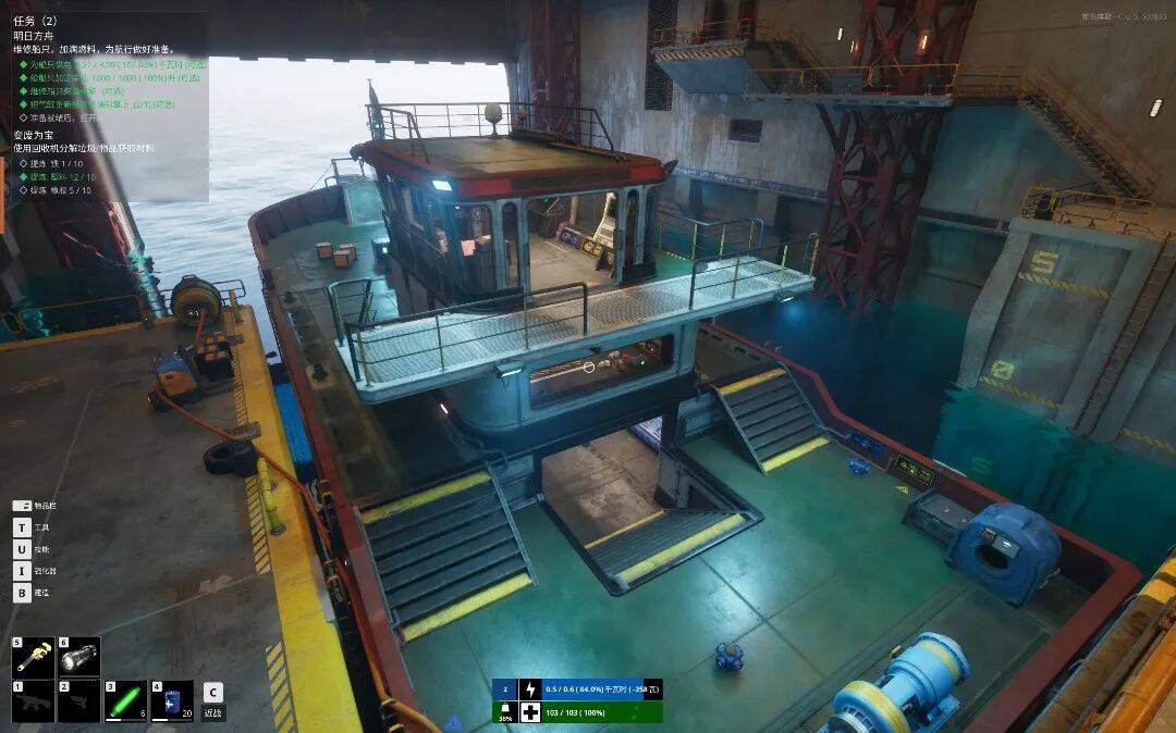 和一般的生存游戏不同,作为“机器人”主角,玩家完全不需要担心食物和淡水的问题,取而代之的是每一步行动都需要消耗电量。不仅是灯光,包括船坞内的一些需要通电的门禁,船只动力的来源,主角自身的运行,维持设施运转,都需要依靠电源以及电缆输送。
