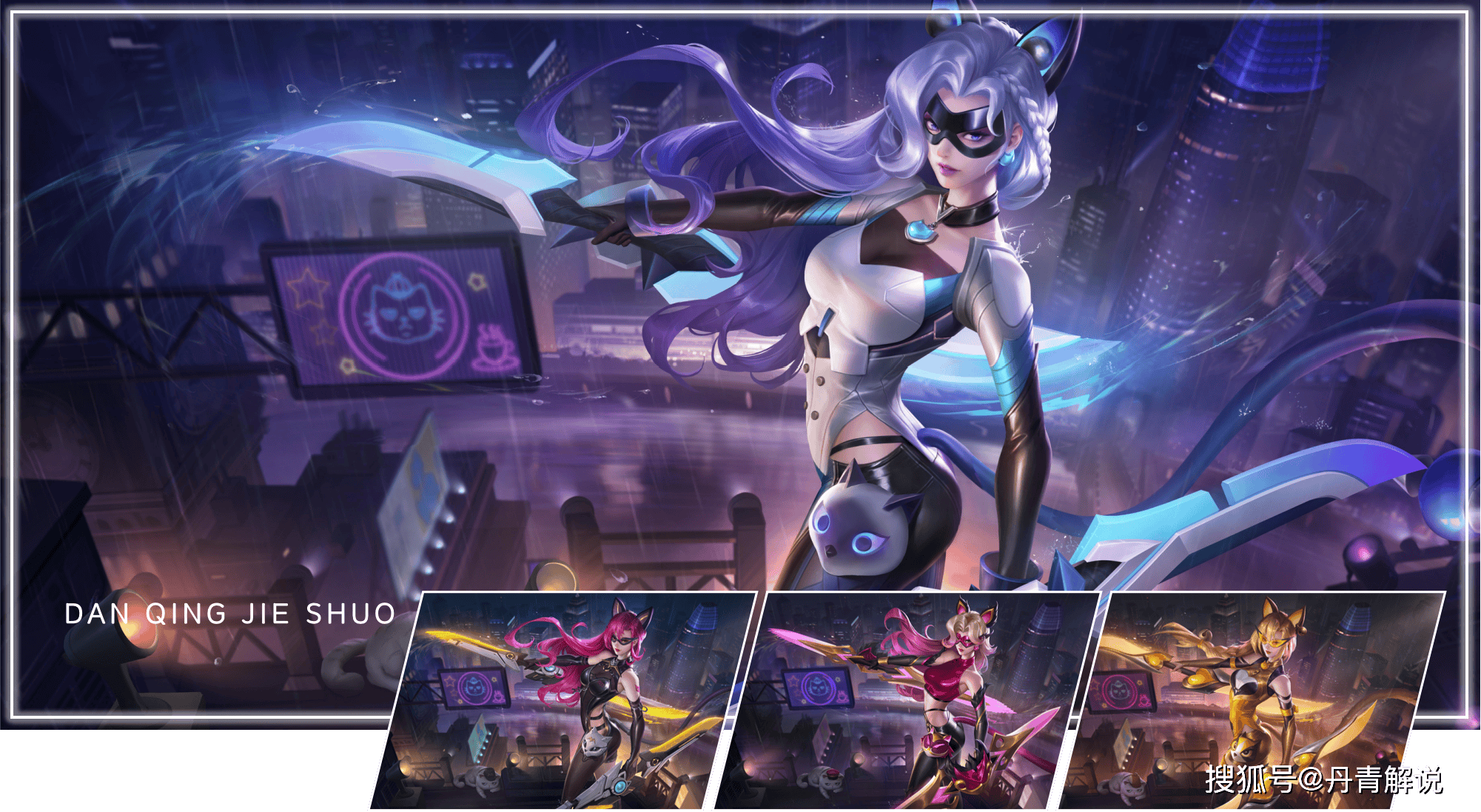 现款暗夜猫娘,除了特工的职业设定之外,还有一种“猫女王”的即视感,普攻双刺附带荧光效果,位移出现了猫扑虚影,大招伴有月亮和黑猫贴图,隐身时还有跑、扑和落地三种猫的动作形态,细节之处颇多。