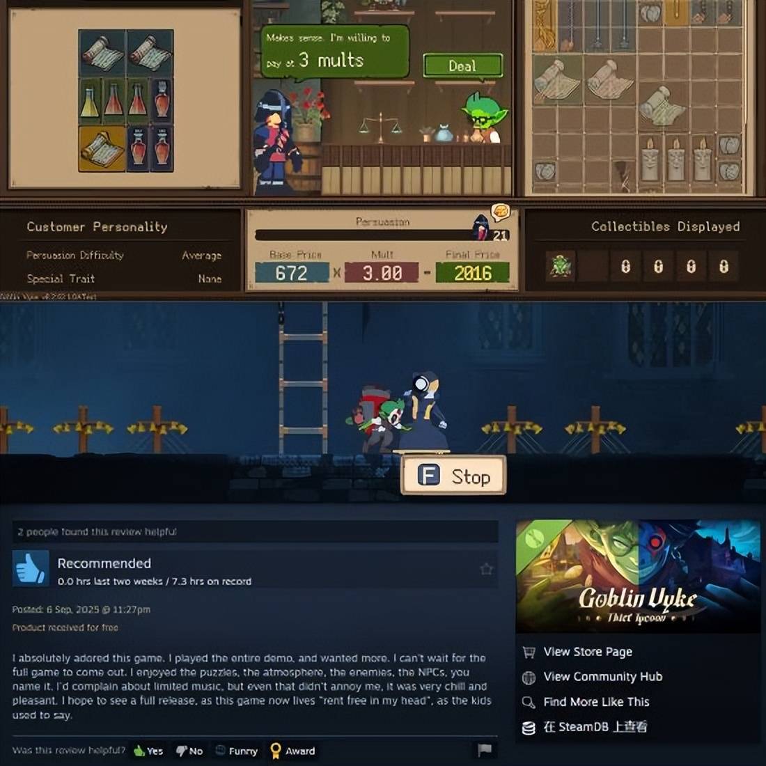 晚上潜入地宫潜行偷宝,白天化身奸商哄抬物价,你就是史上最狡猾的哥布林神偷!《哥布林维克》主打潜行 “搜偷撤” 玩法,避开强敌搜刮宝物,白天再靠口才把赃物卖出高价,在掠夺与经营中积累财富,改写哥布林的命运!游戏 Steam 试玩版已斩获 90% 特别好评,新品节迎来重大更新,新增内容、优化动作并上线大量自定义功能。喜欢潜行与经营的玩家,不妨前往 Steam 体验,用最猥琐的角色偷遍整个地牢!