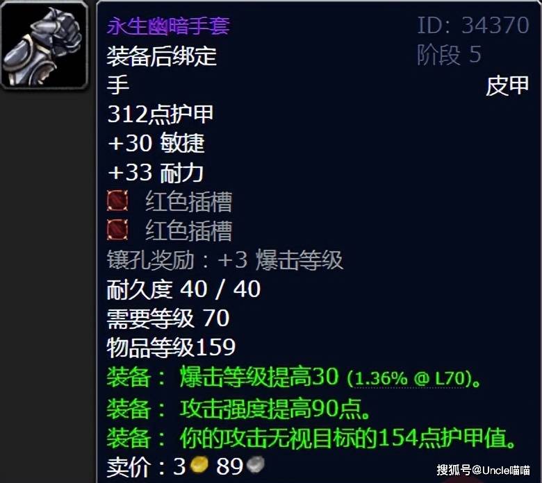 今日最后的制皮专业,喵叔觉得最情怀和极品的是这款皮甲永生幽暗手套,这款手部装备我想都应该听闻过他的大名吧?当年可是大量的狂暴战跨甲穿戴他的,双红色插槽以及高额爆击与破甲真的完美契合狂暴战。那么最后的灵魂拷问给到各位大兄弟,你在TBC周年服选择专业的时候是奔着啥去的呢?我们评论区见!