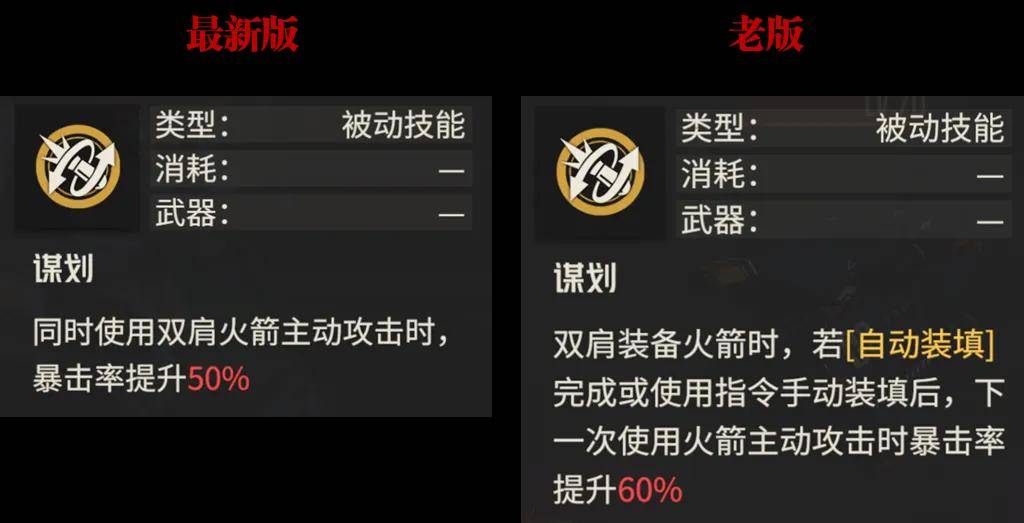 接着第二点是针对【谋划】这个被动做了调整,将暴击率提升的幅度下调了,从最初的60%改为目前的50%,同时也对触发暴击率提升的条件进行了调整,从最初的“自动装填”完毕或手动装填完毕,改为了使用双肩火箭主动攻击即可触发,这个嘛就没有那么容易去评价其加强了多少,毕竟双肩火箭输出的技能也就是超大范围的【漫天】了,而这个技能其实在日常战斗中是很难能作为我们常规输出武器存在的,特殊战斗倒也可以用用,不过太高的AP消耗针对连续使用的确有些吃不消......所以综合艾琳的专武调整,大家觉得这一版的艾琳专武到底如何呢?可以留言来吐槽发现一下自己的意见吧......