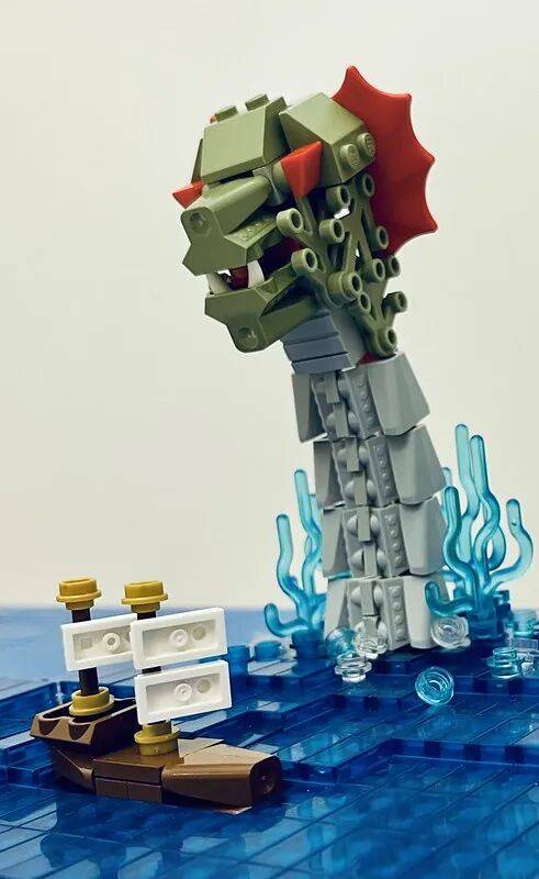 如果你偏爱小巧而富有荒岛余韵的场景,这件作品不会让你失望。种子零件被同时转化为棕榈树干、藏宝箱,甚至一条令人叫绝的鲨鱼;水面通过层级拼搭营造出透视与涟漪,巧妙呼应了前一轮的“蛋壳乌龟”主题。