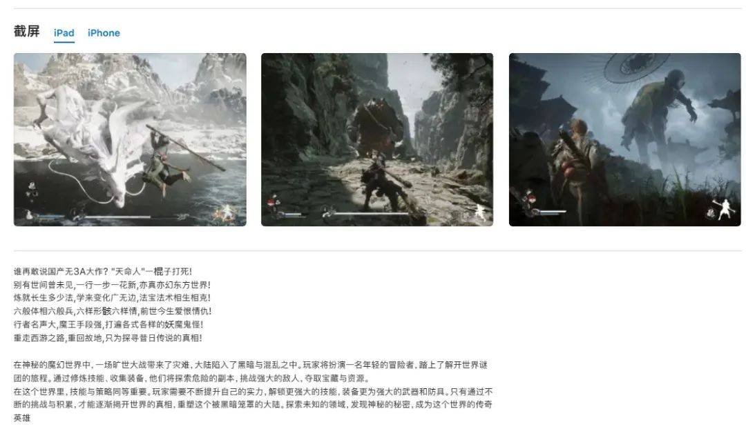 这款所谓的手游截图则直接搬用了《黑神话悟空》的实机原图,游戏介绍也直接套用了官方的宣传语。