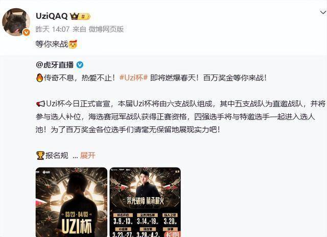 另外一边,除了官方赛事让人期待之外,UZI杯也要来袭了,没错,UZI说到做到,之前就透露了,会举办UZI杯,让更多人有比赛可以看,这种杯赛的观赏性也更强,当然,更多的是满足粉丝们的期待,都想看UZI比赛,虽然职业的来不了,但是这种活动,完全没问题,各位也可以大饱眼福了。