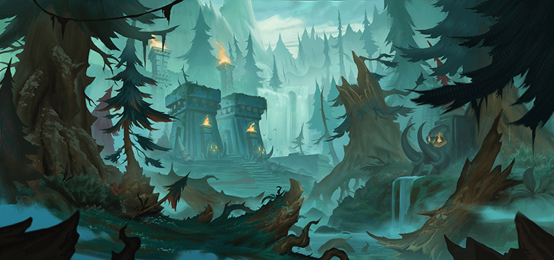 针对祖阿曼,原本在副本中出现的建筑仍会在新地图中保留。我们在“至暗之夜”中对其周边区域进行了重建,玩家从奎尔萨拉斯通过阿曼尼小径进入祖阿曼大门后,第一眼看到的会是原有的副本区域——我们将其命名为“阿塔阿曼”。而“阿塔阿曼”外围区域的设计,我们力求还原早期《魔兽争霸2:黑暗之潮》中玩家熟悉的密集森林和绝美海岸线,让老玩家能感受到熟悉的味道。在此基础上,我们在该区域中设置了大量醒目的地标,让玩家进入区域后,抬眼就能看到不同的兴趣点——比如迷雾中的神庙,而这些兴趣点,能够激发大家的探索欲望。