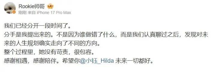 先是小钰发文简单说道:前路自有光,过往皆序章。这个时候便有网友感觉有种分开的味道,但还都保持质疑,接着Rookie便发文说道:我们已经分开了一段时间,分手是自己提出来的,不是因为谁做错了什么,而是我们真的很认真的聊过,发现对未来的规划确实走向了不同的方向。整个过程中,她没有苛责,很包容。感谢相遇和陪伴,希望你未来一切都好。