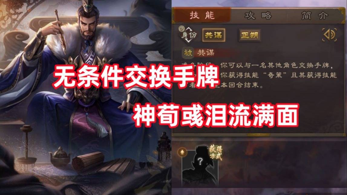 准备阶段,可以与一名其他角色交换手牌,然后本回合桓阶获得技能【奇策】,对方获得技能标【看破】。首先看技能发动时机是准备阶段,也就是不吃兵乐的效果,先换牌再摸牌、出牌,赋予了桓阶很高的灵活性。在自己没有手牌的时候,该技能也是可以发动的,也就是说可以白嫖敌方的一大把牌,代价只是给敌方一个没有用的看破罢了。