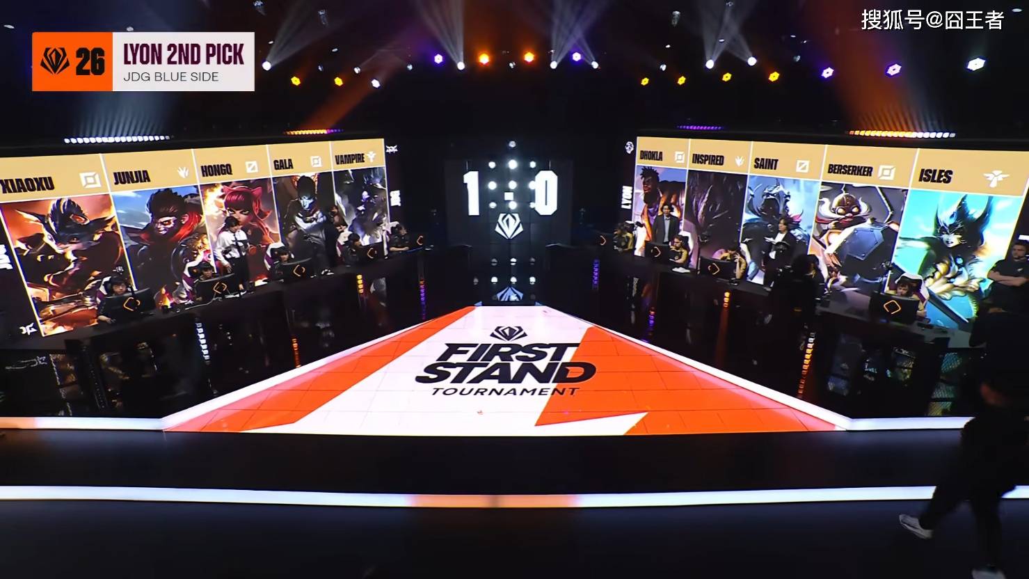 第一局比赛,JDG蓝色方,禁用:潘森、兰博、瑞兹、巴德、洛,选用:Xiaoxu鳄鱼;Junjia赵信;HongQ发条;GALA芸阿娜;Vampire扇子妈;LYON红色方,禁用:皇子、EZ、蔚、轮子妈、烬,选用:Dhokla纳尔;Inspired梦魇;Saint加里奥;Berserker韦鲁斯;lsles妮蔻