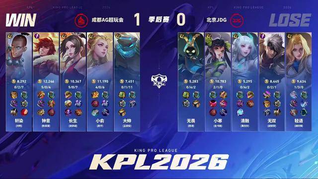 第四局JDG总算是拿到了优势,就当大家以为他们要拿一分的时候,小寒出现了失误。长生的姜子牙闪现烫到苍,元坦大招进场,夏洛特绕后切入,小寒的苍直接没了。轻语的狂铁面对四个人的集火也扛不住了。另一边轩染的夏洛特切死了女娲,AG打了一波零换三。19分钟AG先手开龙,JDG还不想放,无双的老虎跳进去被控了,钟意稳稳控下黑暴。苏烈大招拍三个,但JDG的伤害完全不够,公孙离先点死苏烈再杀狂铁。小俞和钟意继续追JDG中射,在高地前元坦控到女娲,姜子牙完成收割,最终AG4-0战胜JDG,挺进胜者组决赛。