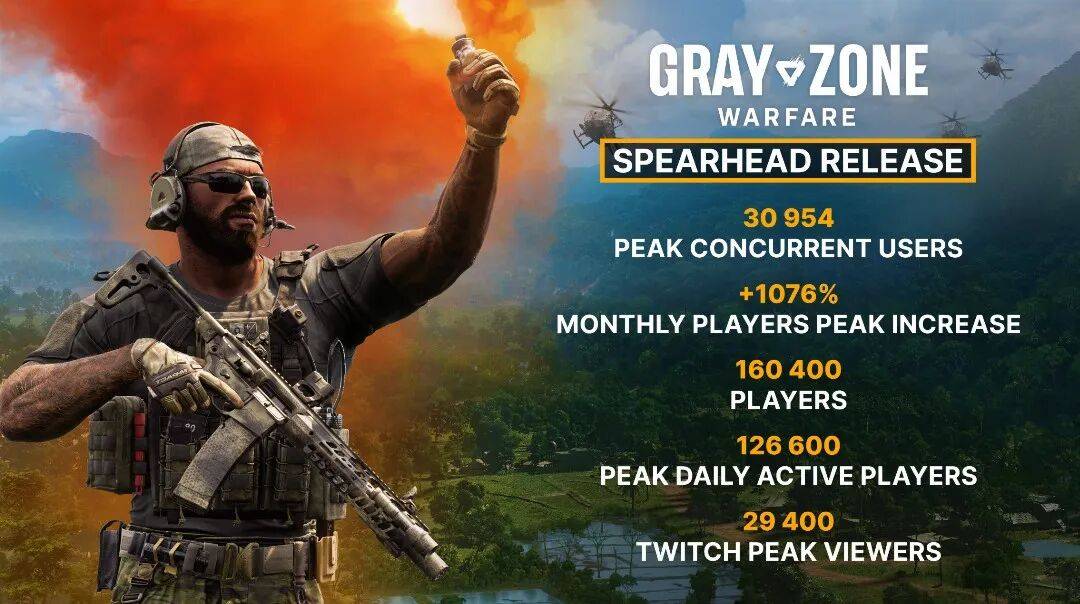 4月3日,军事题材撤离射击游戏《灰区战争》官方发了篇日志,提到有超过16万玩家参与体验了灰区的0.4版本更新,月度玩家峰值更是增长了1076%。
