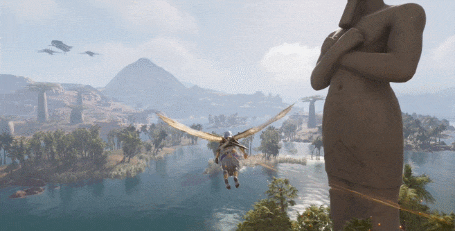 这次的埃及DLC的特别之处很多,例如:不同于传统DLC作为支线或扩充剧情之类的的定位,新玩家也能”零门槛”直接体验全新内容。但论最重点最醒目的,绝对是发售前就已经反复出现在游戏预告片中的“反重力飞船”。