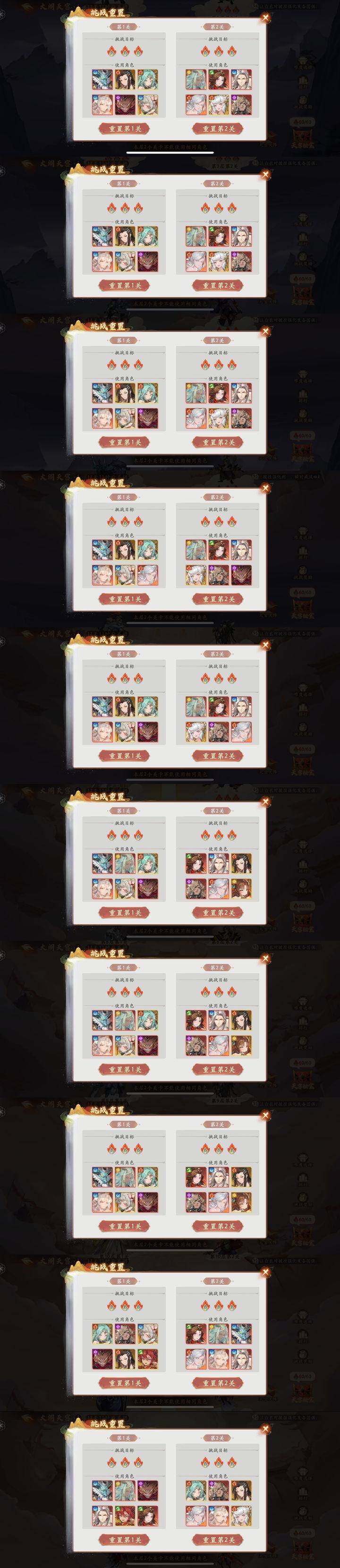 从上往下 依次是1-10的满星阵容 可以自行参考 每人配置不同 自行发挥 祝大家快速通关