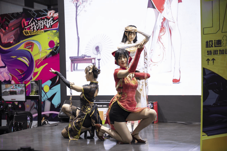 展区除了丰富的玩创体验区,七彩虹还为玩家们准备了每日精彩的舞台活动,特邀B站知名舞蹈区UP主,结合七彩虹全新亮相的IP角色,以拥有梦幻紫发的隐姬和充满元气活力的柒小希COSER的形式亮相,为现场观众带来多场穿越AI次元的梦幻舞台。除此之外,七彩虹精心设计了多个趣味小游戏,能够让台下的观众零距离参与到这场舞台狂欢中。
