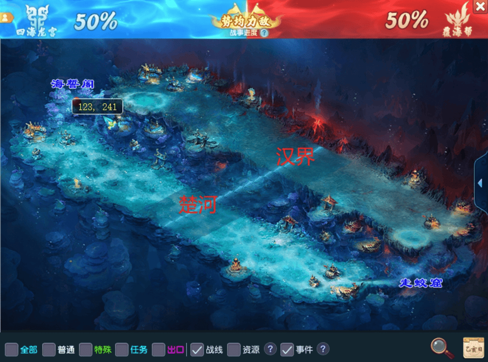 另外,四海龙宫、覆海帮这两大势力还有一个专属的战场,在这个场景中,只要对方势力的玩家过了这条“三八线”似乎就能自由发起跨服PK了,想想都感觉挺刺激的有木有?