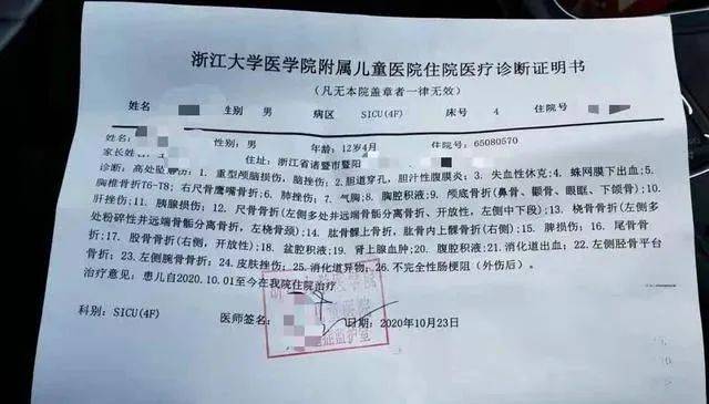 诊断书上显示:“ 小军一共有23处诊断记录,包括重型颅脑损伤,失血性休克,消化道出血,全身多处骨头骨折等等。”