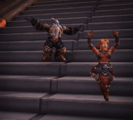 通过/dance命令触发,魔兽历史有过很多经典的舞蹈表情,如男地精的“Crank That (Soulja Boy)”,以及男兽人的“U Can't Touch This”。新种族不一定有新表情,例如玛格汉兽人、黑铁矮人,他们跟兽人和矮人共用一个舞蹈动作。而在土灵的舞蹈出来之后,很多人认为他们跳得最好。