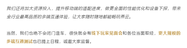 然而对于注重玩家游戏体验,以“刷新行业规格的最高品质,走到最广大的玩家面前”为目标的燕云团队来说,任何影响玩家游戏体验的问题都是不被允许的。即使这一决定可能引起部分玩家的不满,也依旧抗住压力推迟公测,这不仅仅是制作者对游戏品质的执着,更是对每一位支持并热爱武侠游戏玩家的负责!