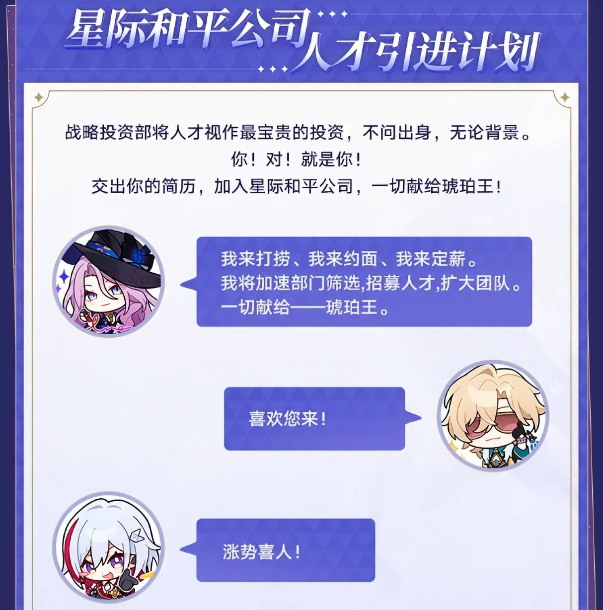 本次招聘活动是以翡翠的身份开启的。她作为星际和平公司战略投资部的成员,以玩梗的方式,让玩家们制作自己的开拓者简历,来加入星际和平公司,并将一切都献给琥珀王。