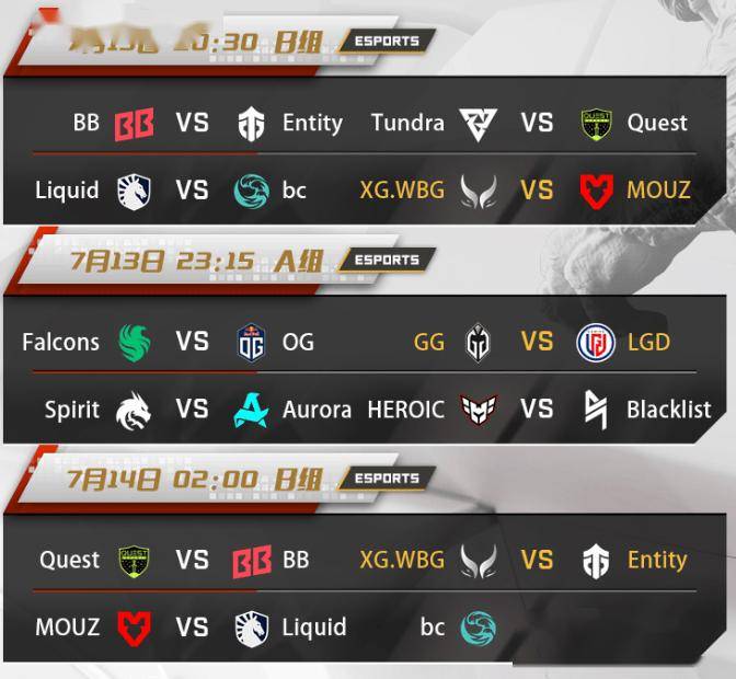 今日的比赛依旧为 20:30 开启,XG 战队率先迎战 MOUZ 战队,LGD 对阵 GG 战队的比赛 23:15 开启,XG 与 Entity 的对决将于明日(7 月 14 日)凌晨 2:00 举行。