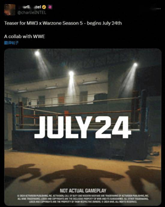 《COD20》官推显示,本作将在第五赛季和WWE联动,赛季更新日期为7月24日。预告内容中出现了标志性的摔角擂台以及多位摔跤手的影子。