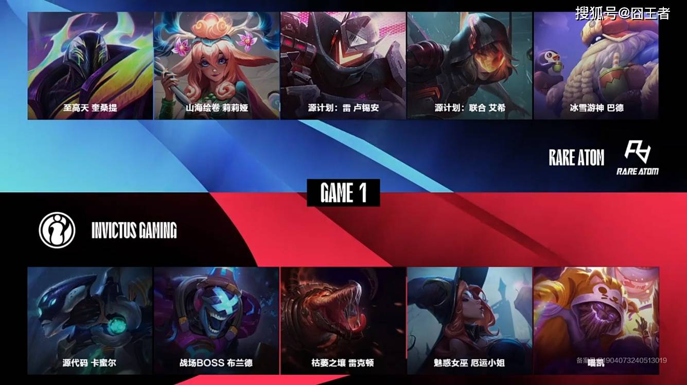 第一局比赛,RA蓝色方,禁用炸弹人、豹女、女坦、泰坦、芮尔,选用奎桑提,莉莉娅,卢锡安,寒冰,巴德;IG红色方,禁用兰博、小炮、贾克斯、布隆、牛头,选用青钢影、火男、鳄鱼、女枪、茂凯