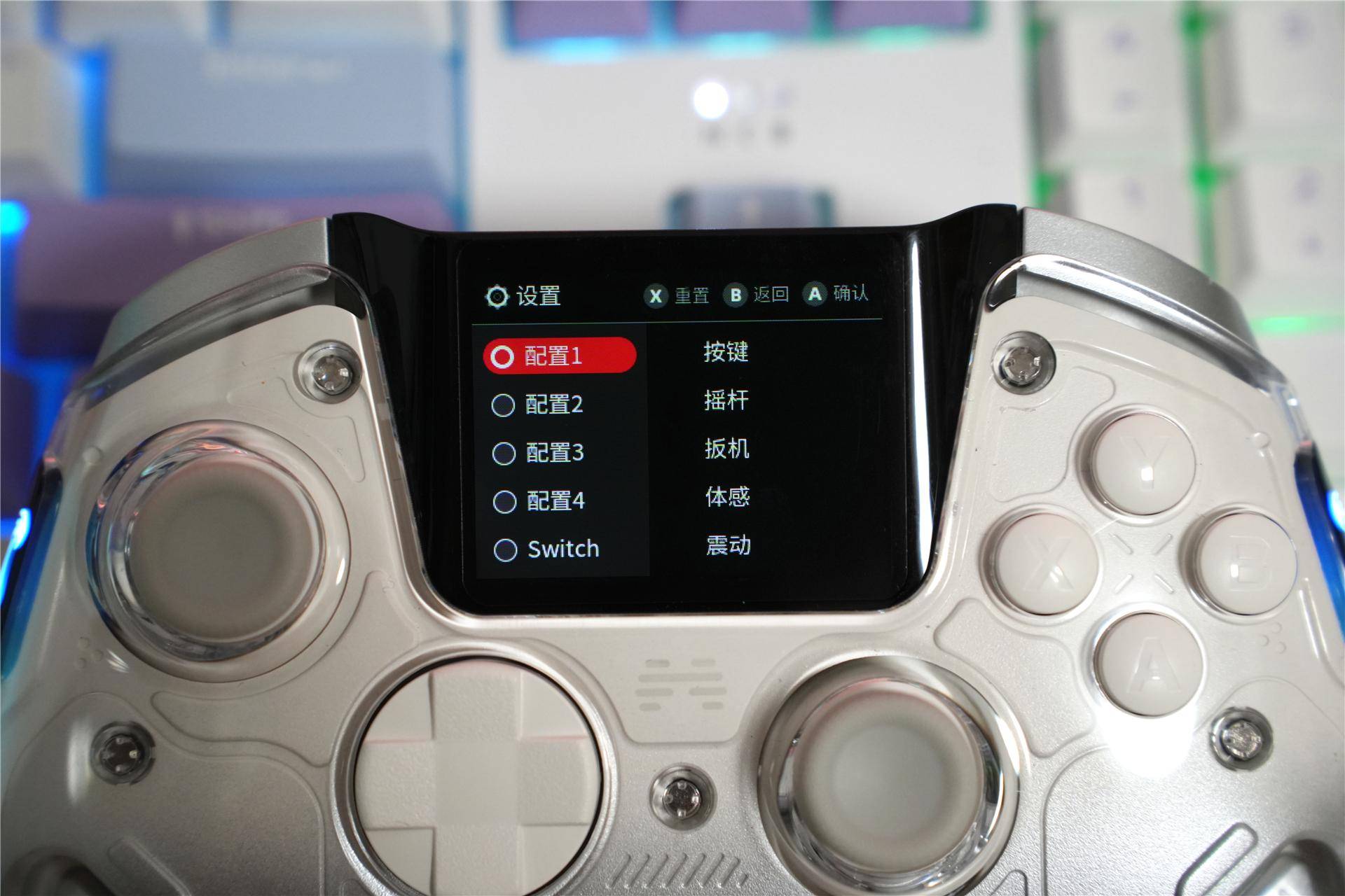 屏幕LED菜单,里面支持屏幕亮度、手柄侧面RGB灯颜色、模式调整。