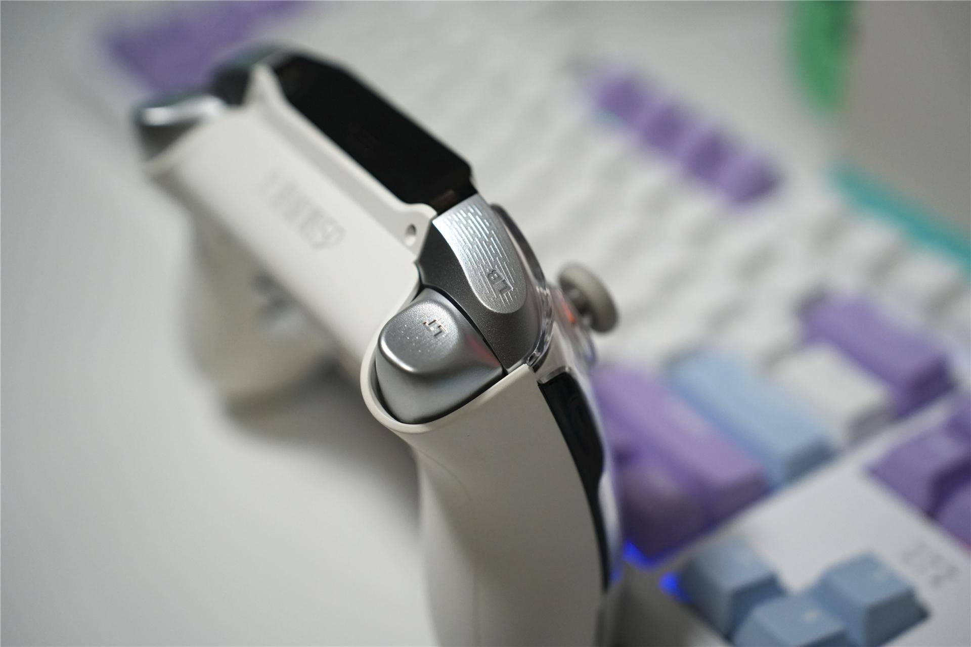手柄正面,白色+银色的渐变+黑色屏幕+透明外壳的搭配,科技十足,白色桌搭的绝配单品。我的这款为云翼白配色,还有大黄蜂配色、即将7月上市的《鸣潮》限量款配色。