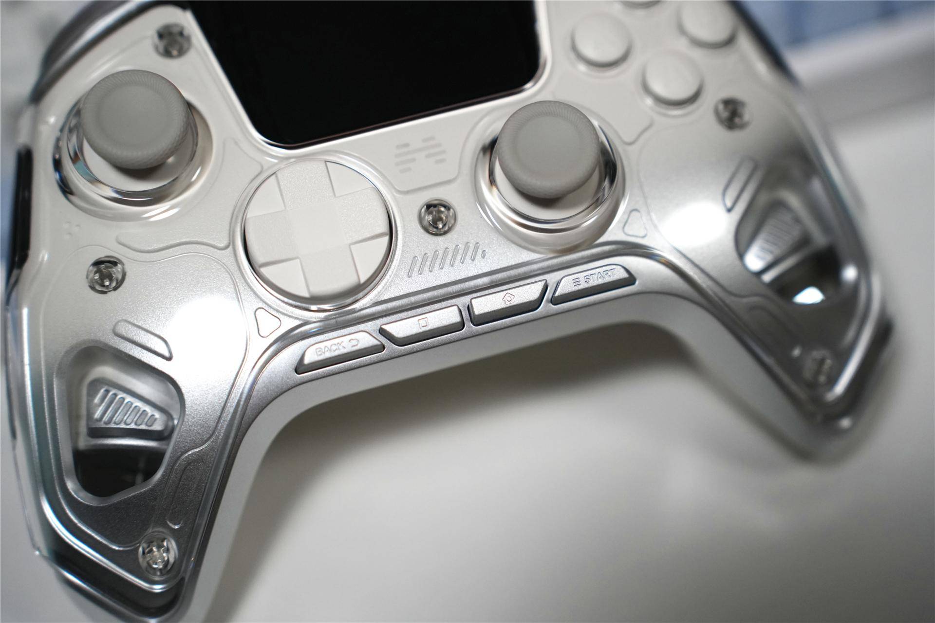 最下方的横排就是手柄菜单返回、截图、HOME键、菜单开始键。两拇指均能轻松够到按压。手柄处有透明开窗的设计,可以看到里面的震动马达,科技感十足。