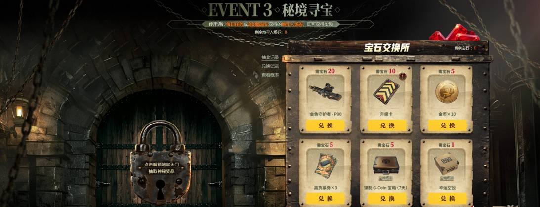 利用任务中获得的地牢入场券,玩家可以踏入神秘的秘境,寻找珍贵的碎片与宝石。收集到足够数量的碎片和宝石后,便可在活动页面兑换心仪的奖励。其中,首次公开的“金色守护者 - P90”更是让无数玩家为之疯狂。