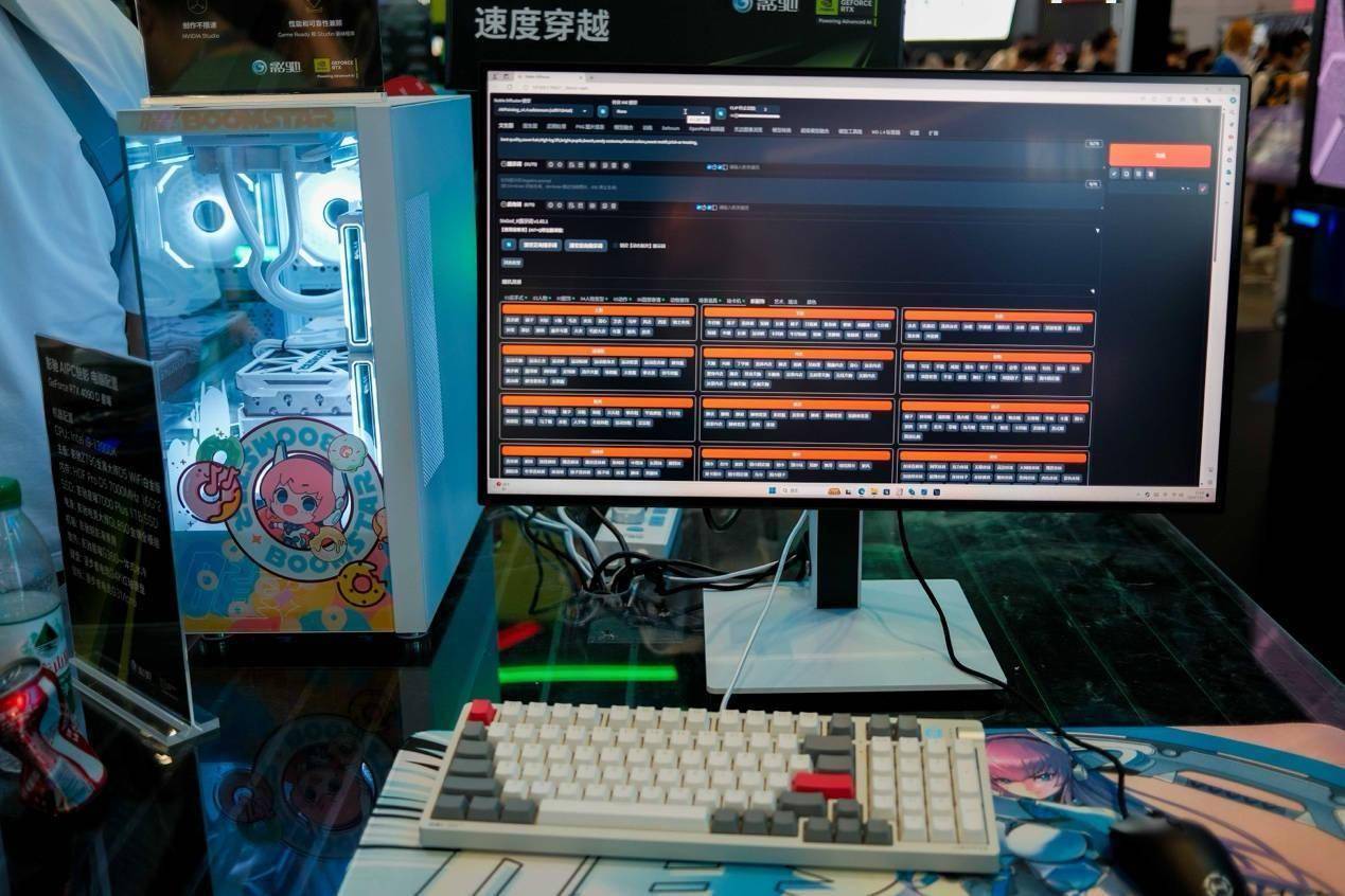 二楼的桌搭区域,影驰此次带来了一套非常少女的桌搭风格,搭载了 GeForce RTX 4070 Ti 金属大师 OC,性能颜值两不误。