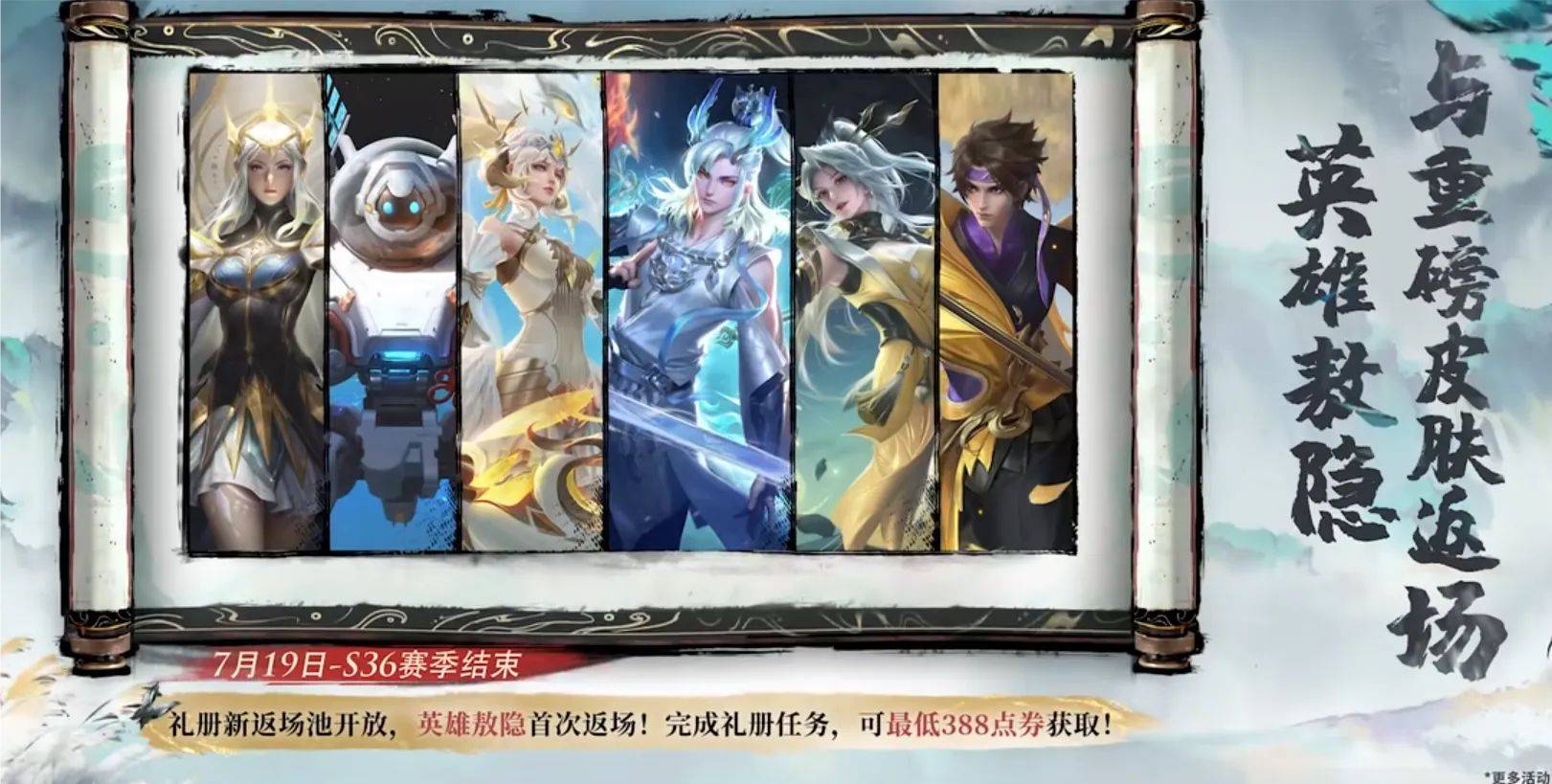 通过海报内容可以看到还有赵云,上官婉儿,露娜,伽罗,盾山的皮肤进行返场。