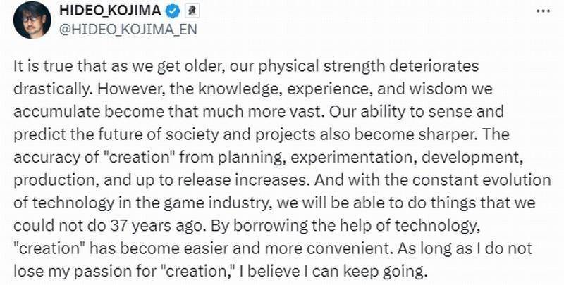 小岛秀夫表示:“随着年龄的增长,我们的体力会急剧下降。然而我们积累的知识、经验和智慧会变得更加庞大。 我们对未来社会和项目的感知和预测能力也变得更加敏锐。 从规划、实验、开发、制作到发布,创作的准确性会越来越高。