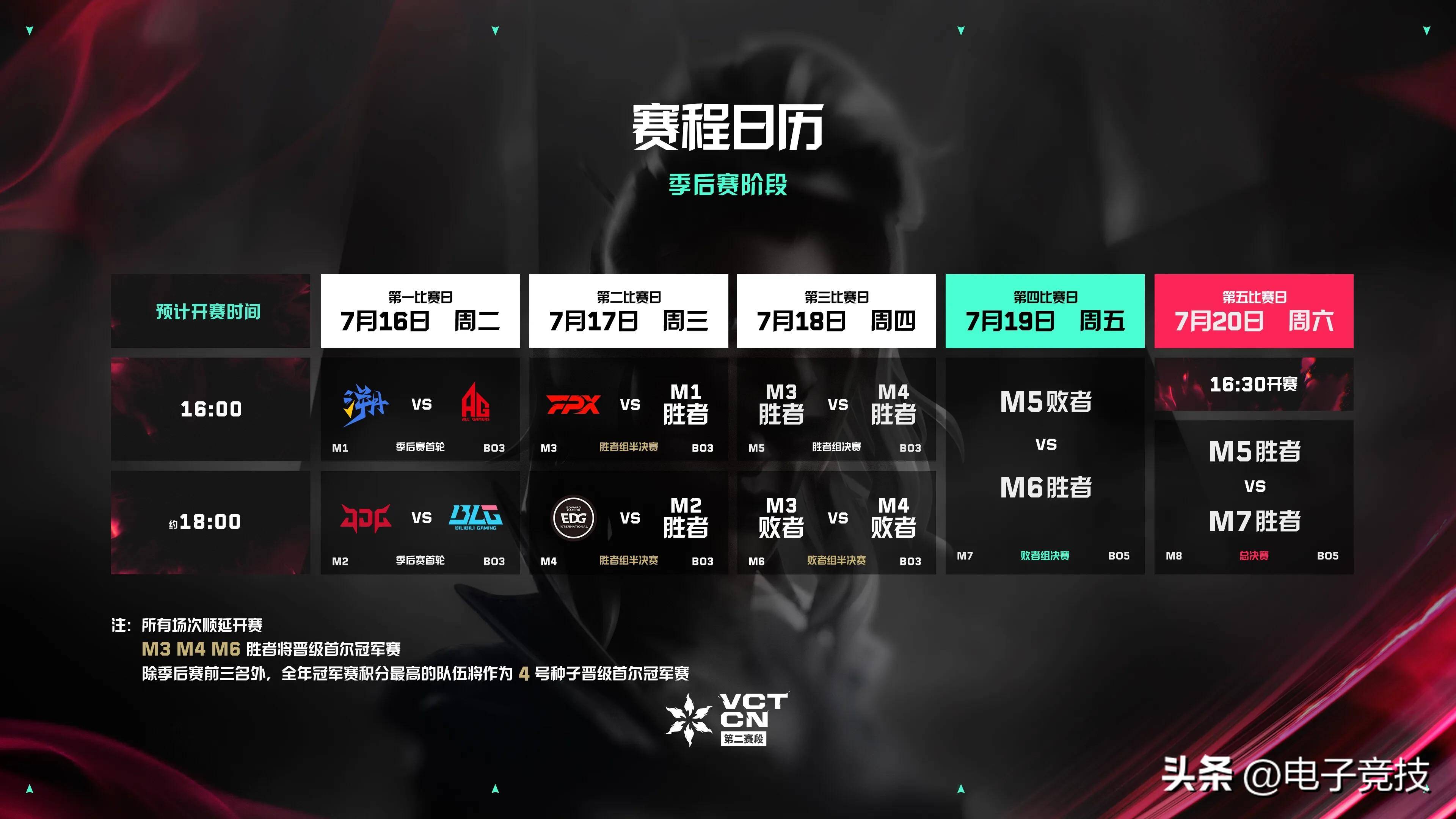 经过激烈的常规赛比拼,EDG、 FPX、 TE、 JDG、 BLG、 AG六支队伍脱颖而出,他们将在季后赛争夺全球冠军赛的资格和首个VCT CN联赛年度总冠军!季后赛首日揭幕战将由TE对战AG,TE曾在常规赛交锋中以2-0战胜对手,揭幕战将是TE的荣誉之争还是AG的复仇之战?第二场则是JDG对战BLG,BLG作为老牌强队实力不容小觑,而JDG作为最后晋级季后赛的队伍也展现出来顽强的意志,到底鹿死谁手?随后两场比赛的胜者将进入四强,分别对战常规赛积分排名前二,季后赛首轮轮空的EDG与FPX。面对屡次进入国际赛的强劲对手,晋级队伍将如何应对?是王者不衰还是新王当立?让我们拭目以待!