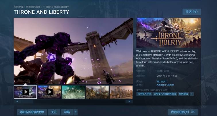 使用外区账号登录steam,进入steam商店页面找到【THRONE AND LIBERTY】游戏页面,将页面下拉就可以下载游戏了。