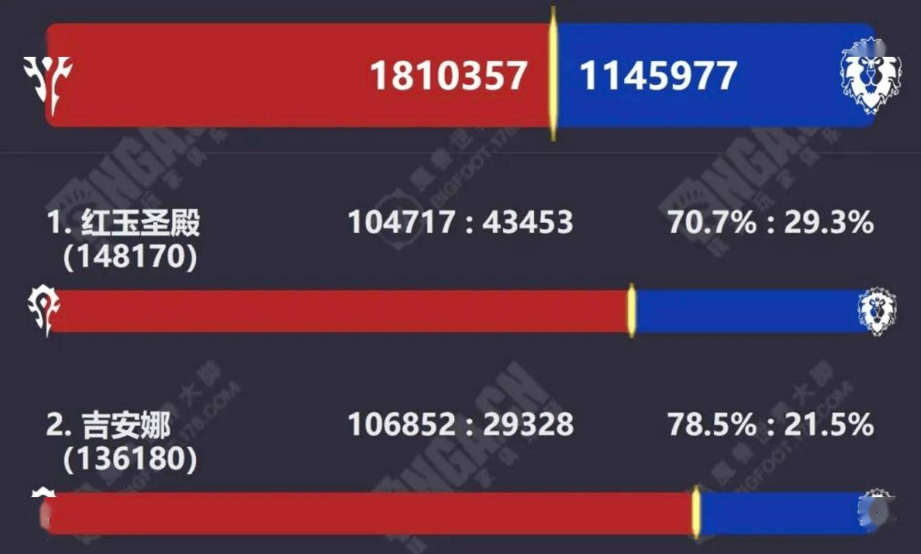 而目前排名比较靠前的服务器几乎都是一边倒的单边服,暂时农工没有发现哪些人数比较多但是不是单边服的情况,这些服一旦出现了单边服那么必然会影响到游戏中PVP的玩法,但是随着魔兽世界游戏的发展和玩家们的迭代其实喜欢PVP的玩家数量也下降了不少,所以此时单边服与否似乎并没有那么重要了,未来魔兽世界官方会不会花费时间让单边服变得平衡还是未知数。