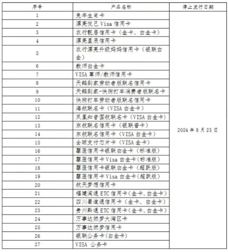 7月10日,农业银行信用卡中心公告称,2024年8月23日起,该行将停发27款信用卡产品,其中包括天鹅到家劳动者版联名信用卡、快狗打车劳动者版联名信用卡、海航联名卡(VISA白金卡)等多款联名信用卡。