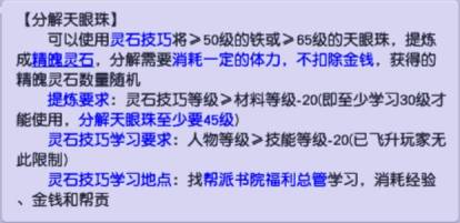 但是,俗话说得好,技术再高,也有马失前蹄的时候,面对那些普普通通的天眼珠,各位少侠也别着急上火。咱直接使用辅助技能“灵石技巧”,就可以将这些天眼珠分解成灵石哦。