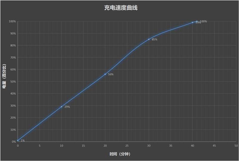 经过灭屏充电实测,10分钟电量从1%充至29%,20分钟后电量过半,达到56%,半小时后电量来到了85%,最终完全充满用时41分钟。