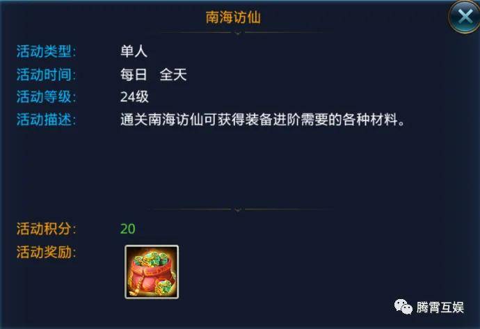 装备进阶材料获得的主要副本,就是南海访仙,该副本在玩家等级达到24级开启,属于单人副本,每日可进行一次挑战。