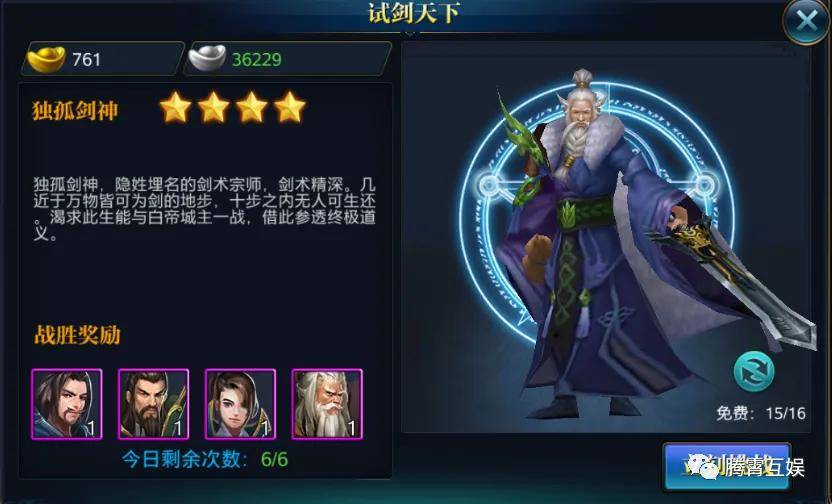 副本试剑天下是卡牌系统激活卡牌缘分的一个重要副本,卡牌除了在江湖游历中获得以外,还可以通过试剑天下副本获得,该副本30级开启,属于单人副本,点击前往即可进入,试剑天下副本有不同的星级,运气好的话可以得到高级星级卡牌的挑战资格,或者玩家通过vip6获得卡牌的刷新机会。