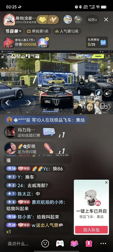 本次夏环也出现了令人惊艳的云游玩法:《极品飞车:集结》首发应用“一键上车”。即点即玩的“一键上车”玩法,一改传统单向度互动的直播方式,打破了次元壁,促使普通观众从主动留在直播间、到参与互动,再到自发体验游戏。当天,主播陈伯带来了紧张刺激的跨界竞速主播比赛,其中,与观众进行“一键上车”的玩法互动,直接将当天氛围感拉满。