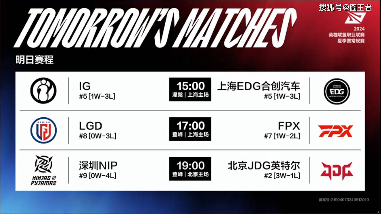 根据夏季赛赛程,7月19日安排了三场赛,分别是涅槃组的IG大战EDG,登峰组LGD大战FPX,以及今天的焦点之战NIP大战JDG。